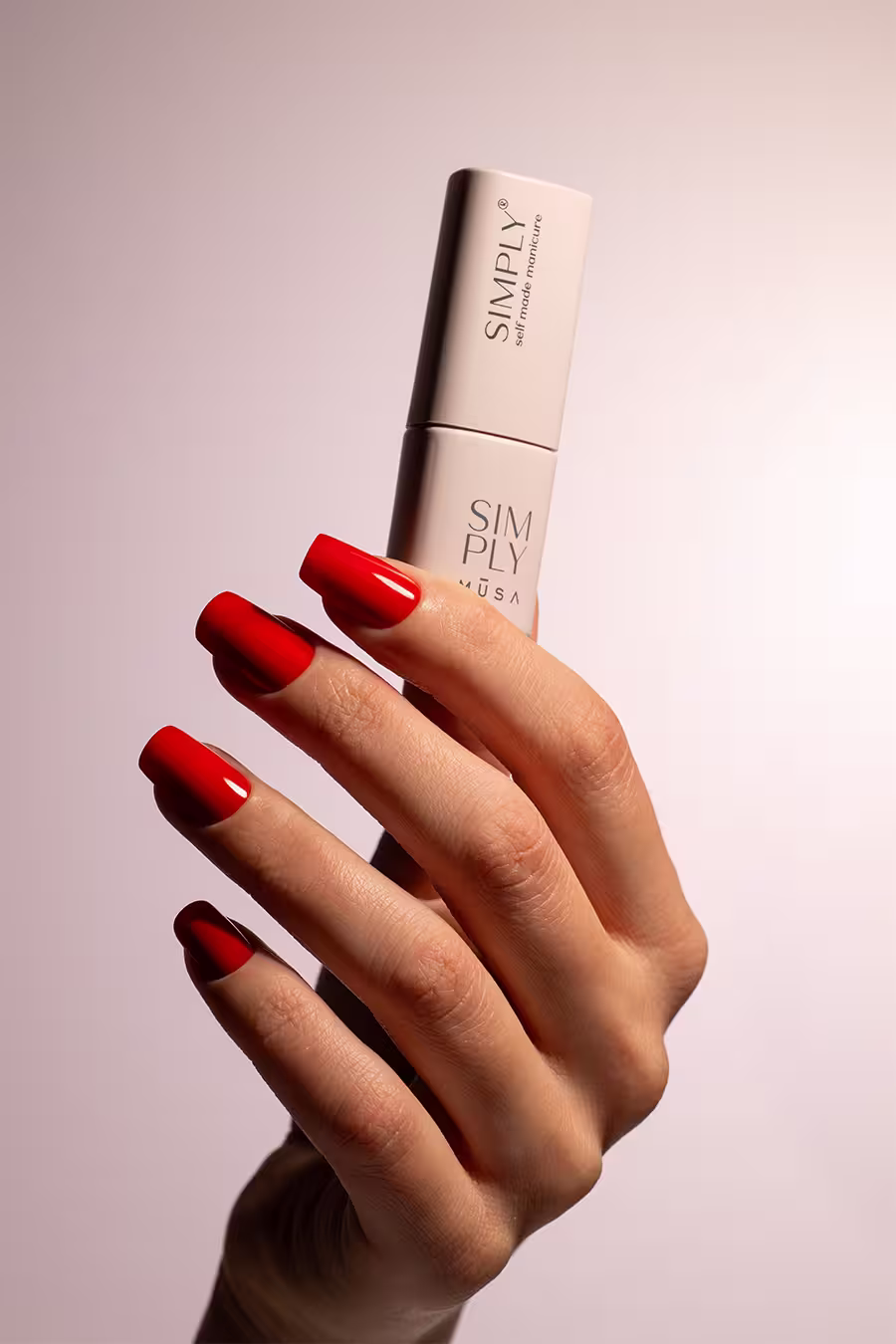 Gel semipermanente rojo lava Simply Musa. Tono vibrante, fórmula sin HEMA, aplicación fácil y duración impecable hasta 3 semanas. Profesional y seguro.