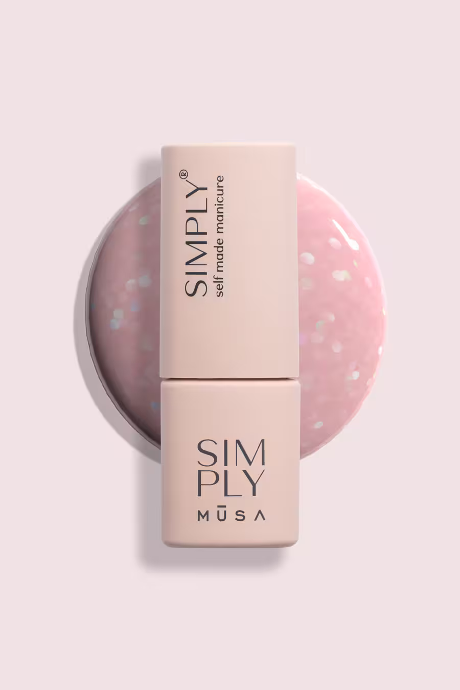 Gel semipermanente rosa iridiscente Simply Musa. Alta cobertura, efecto brillante y fórmula sin HEMA. Manicura elegante y segura hasta por 3 semanas.