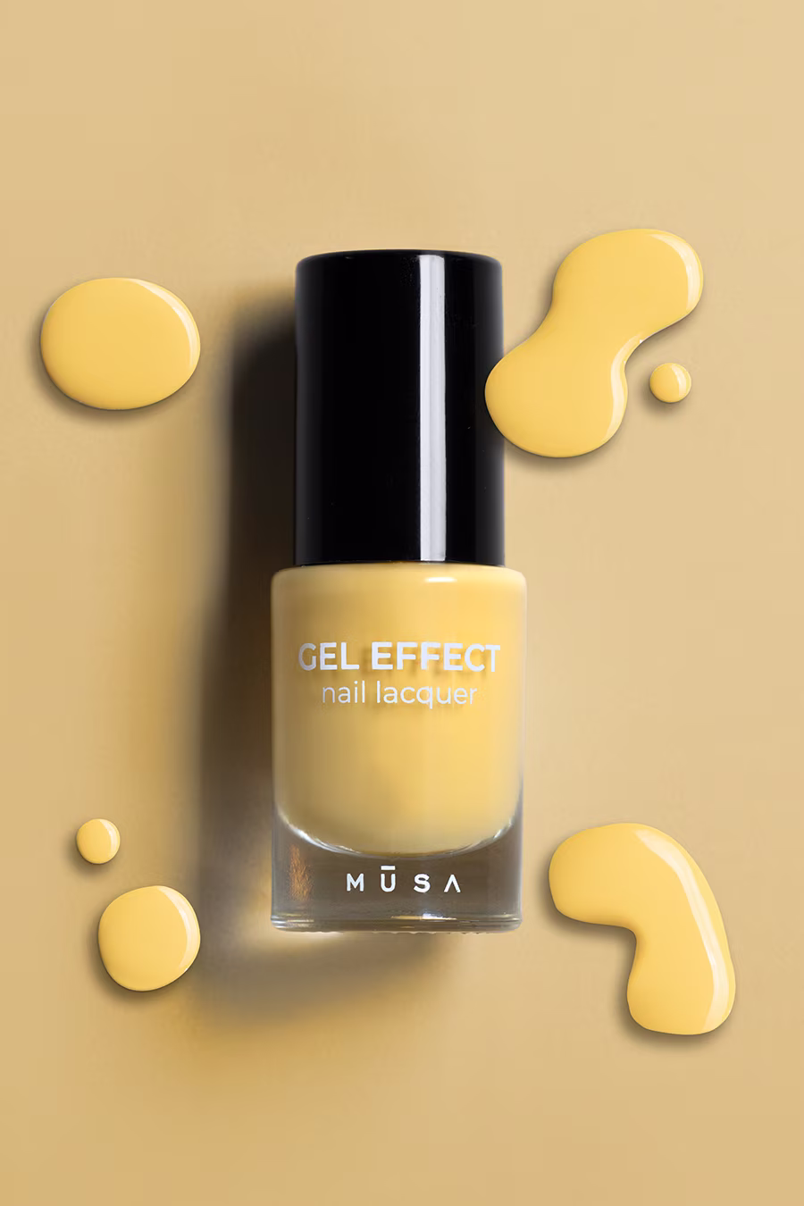 Esmalte Efecto Gel 40 – Amarillo Vainilla: tono amarillo suave y elegante, fórmula vegana, secado al aire, acabado tipo gel y duración de hasta 7 días.