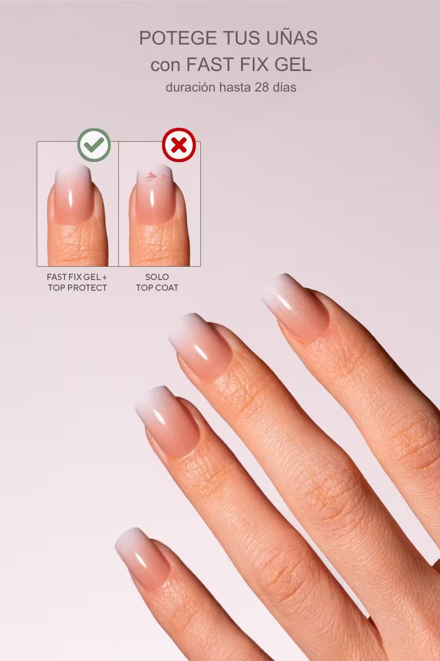 • Aplica una fina capa de Fast Fix Gel sobre la uña y cura con lámpara LED/UV.