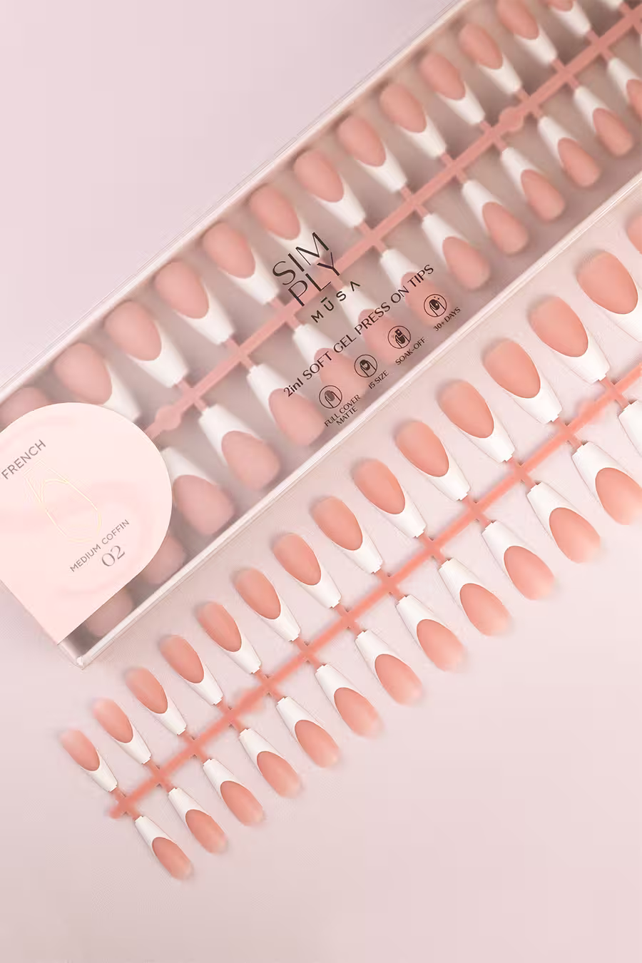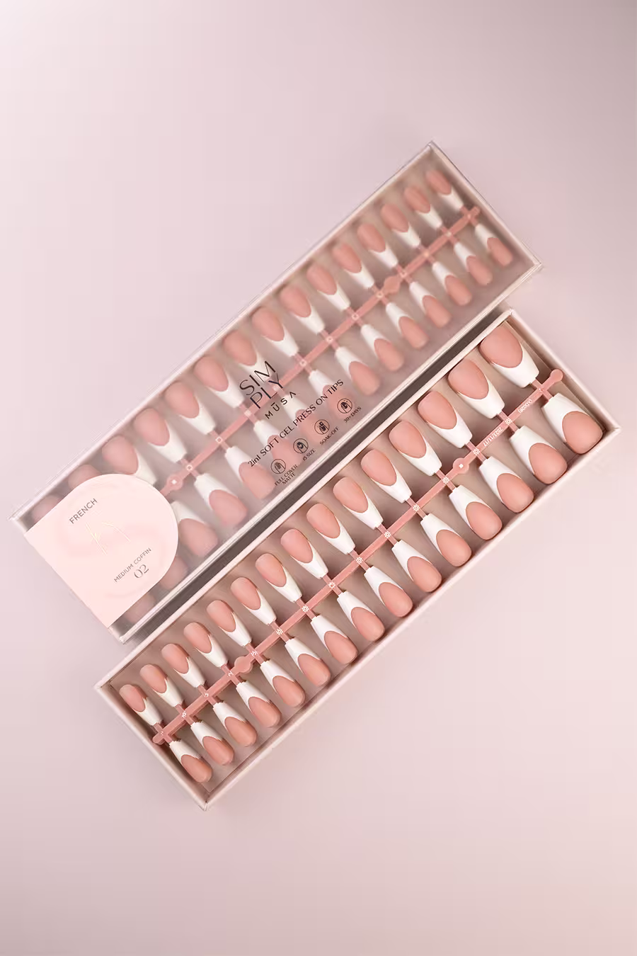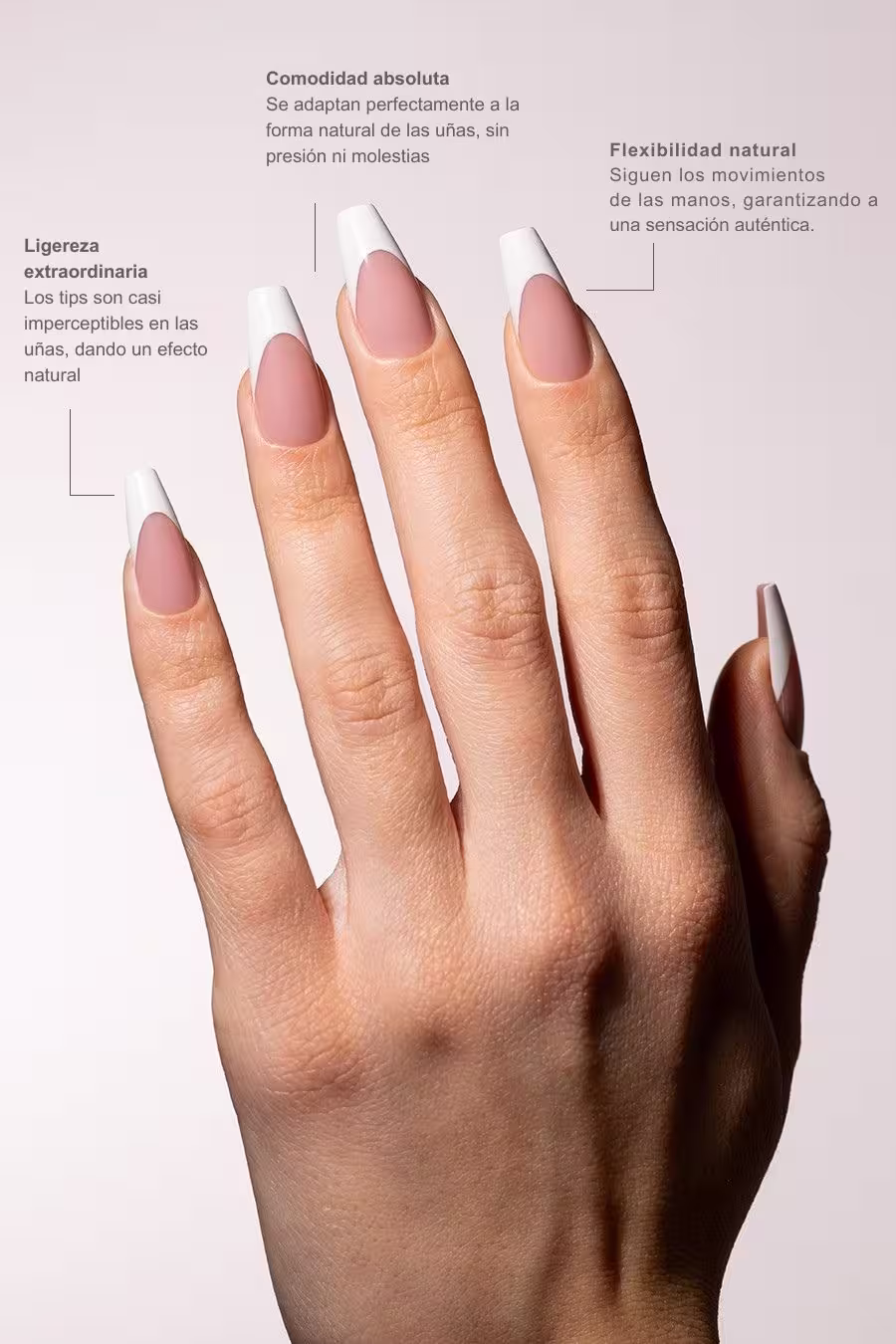Tips soft gel press on french coffin media 02 Cover Nude. 240 uñas resistentes, en forma coffin media, listas para aplicar. Acabado natural y elegante. Hasta 3 semanas de duración.