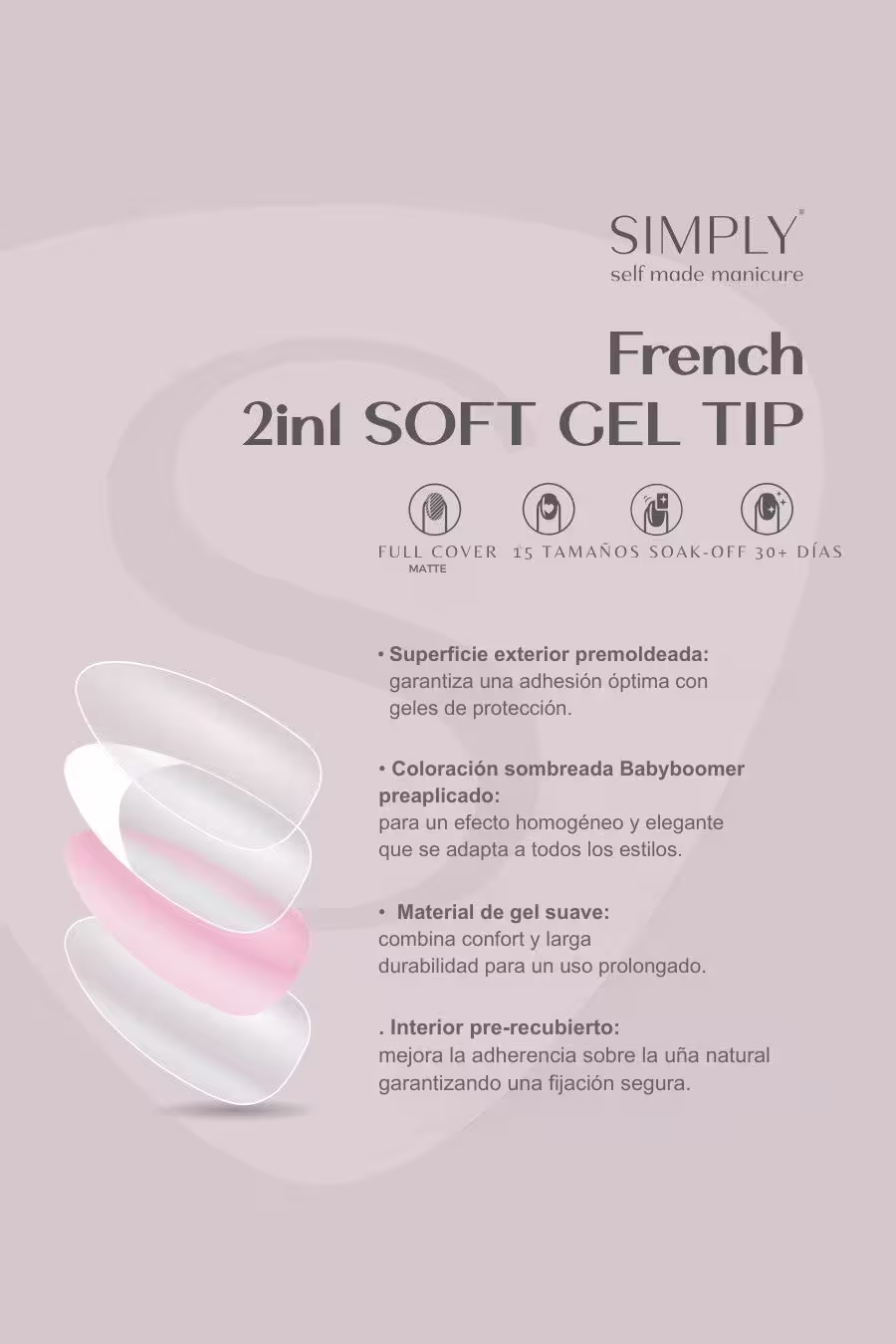 Tips soft gel press on french cuadrada redondeada corta en tono Cover Nude. Manicura elegante y cómoda con 240 uñas por caja. Fácil aplicación y acabado profesional.