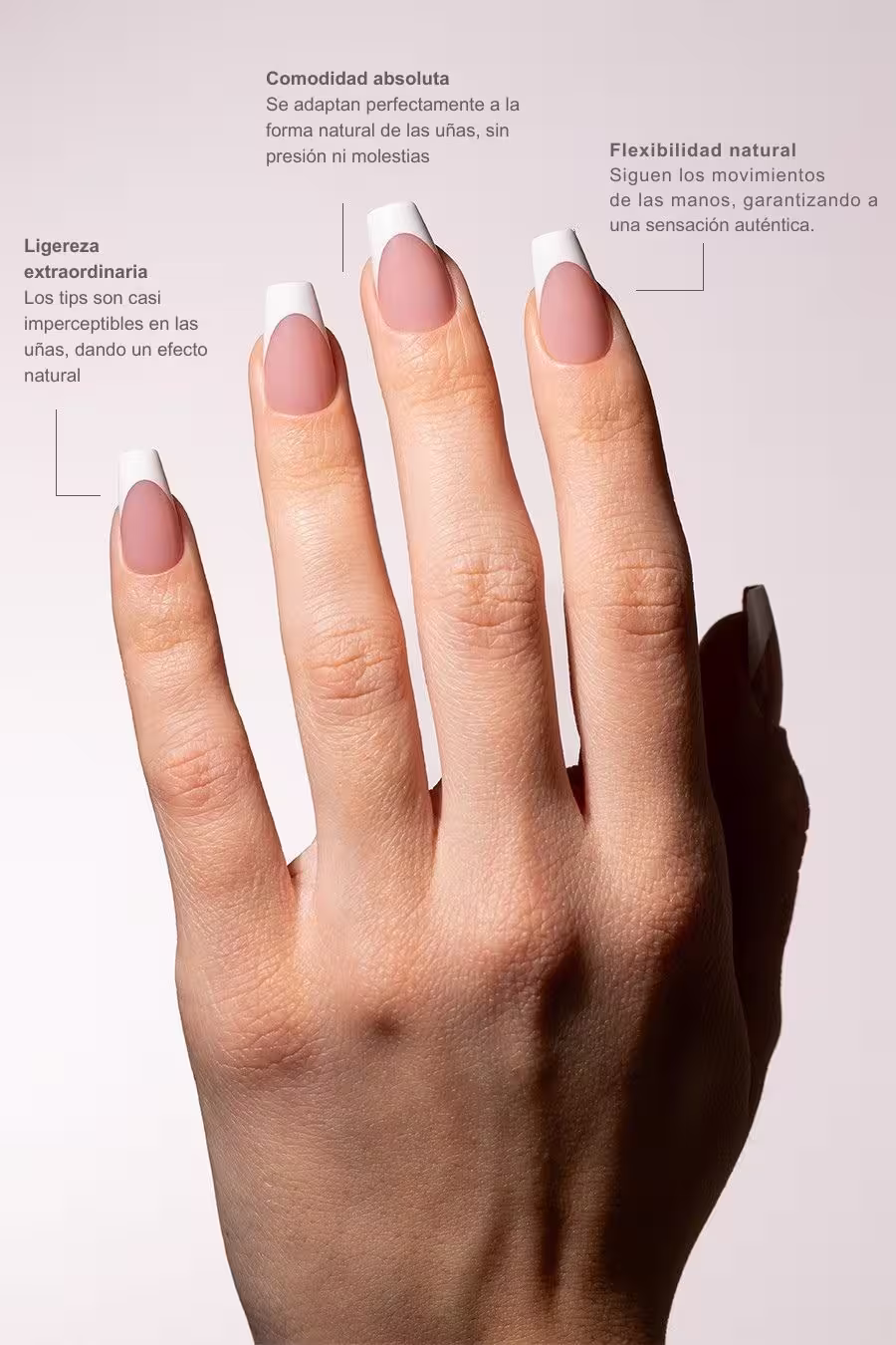 • Elige la tip soft gel press on french cuadrada redondeada corta adecuada para cada uña.