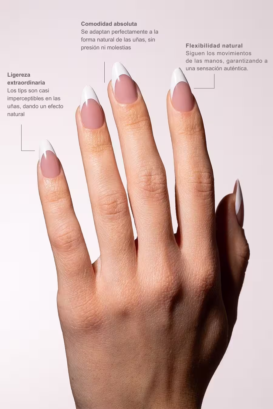 Tips soft gel press on french almendra media Cover Nude. Manicura francesa profesional, fácil de aplicar, elegante y duradera. Hasta 16 usos por caja. Color neutro cubriente y sofisticado.